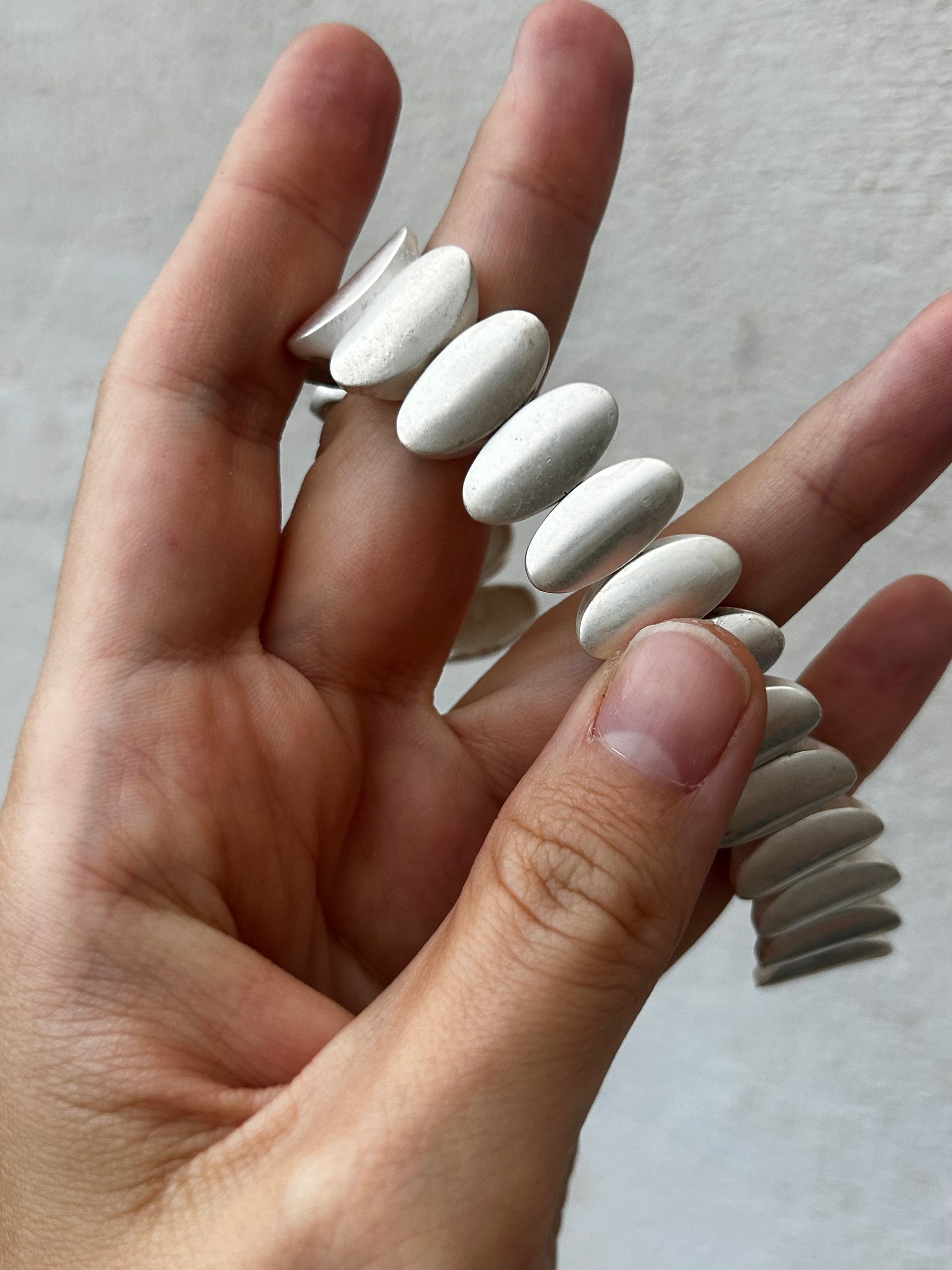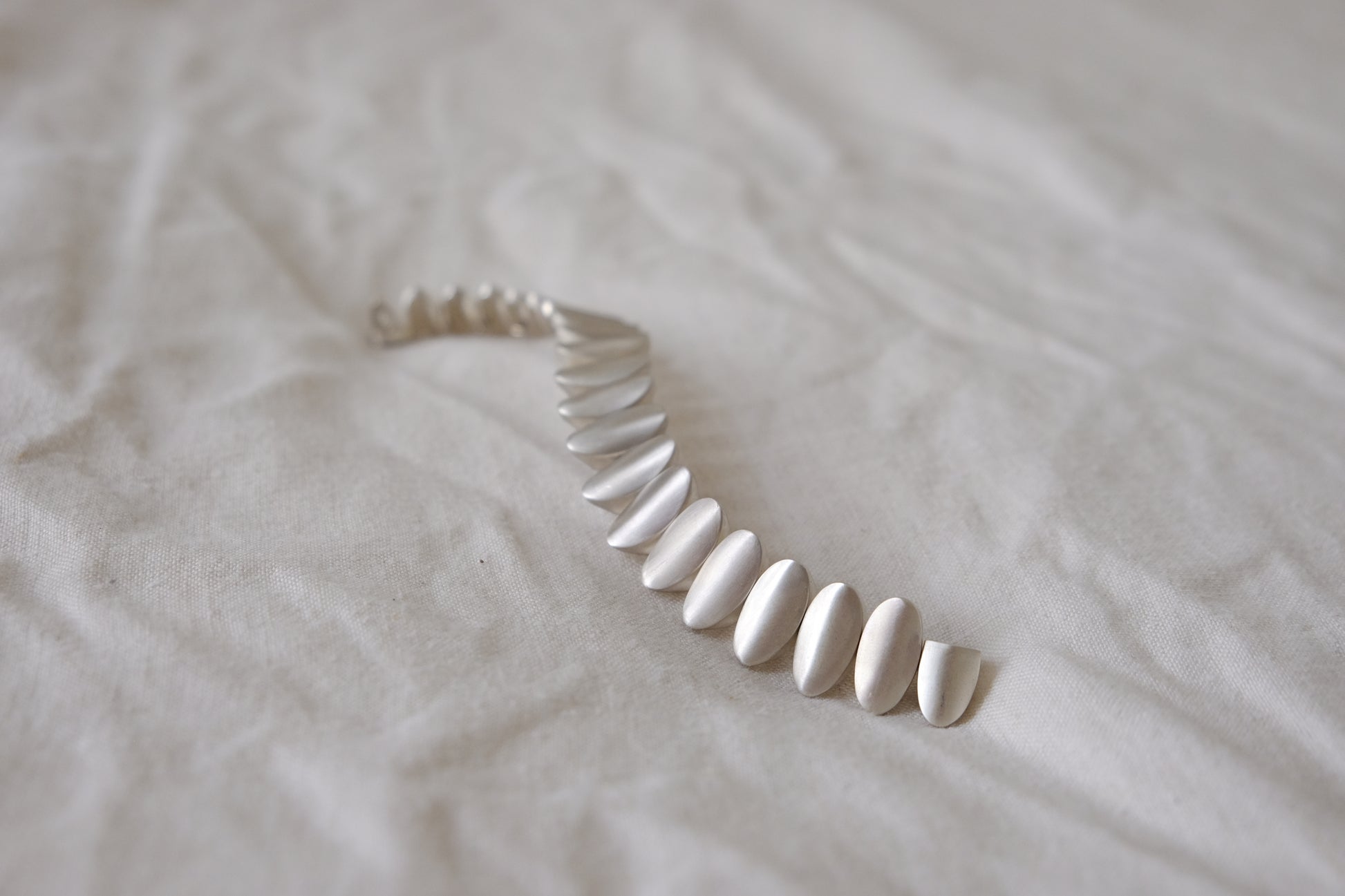 Handcrafted sterling silver articulated bracelet. Each link is cast in silver from wax and individually assembled in our studio. Pictured here at 25cm long; custom sizes available upon request.