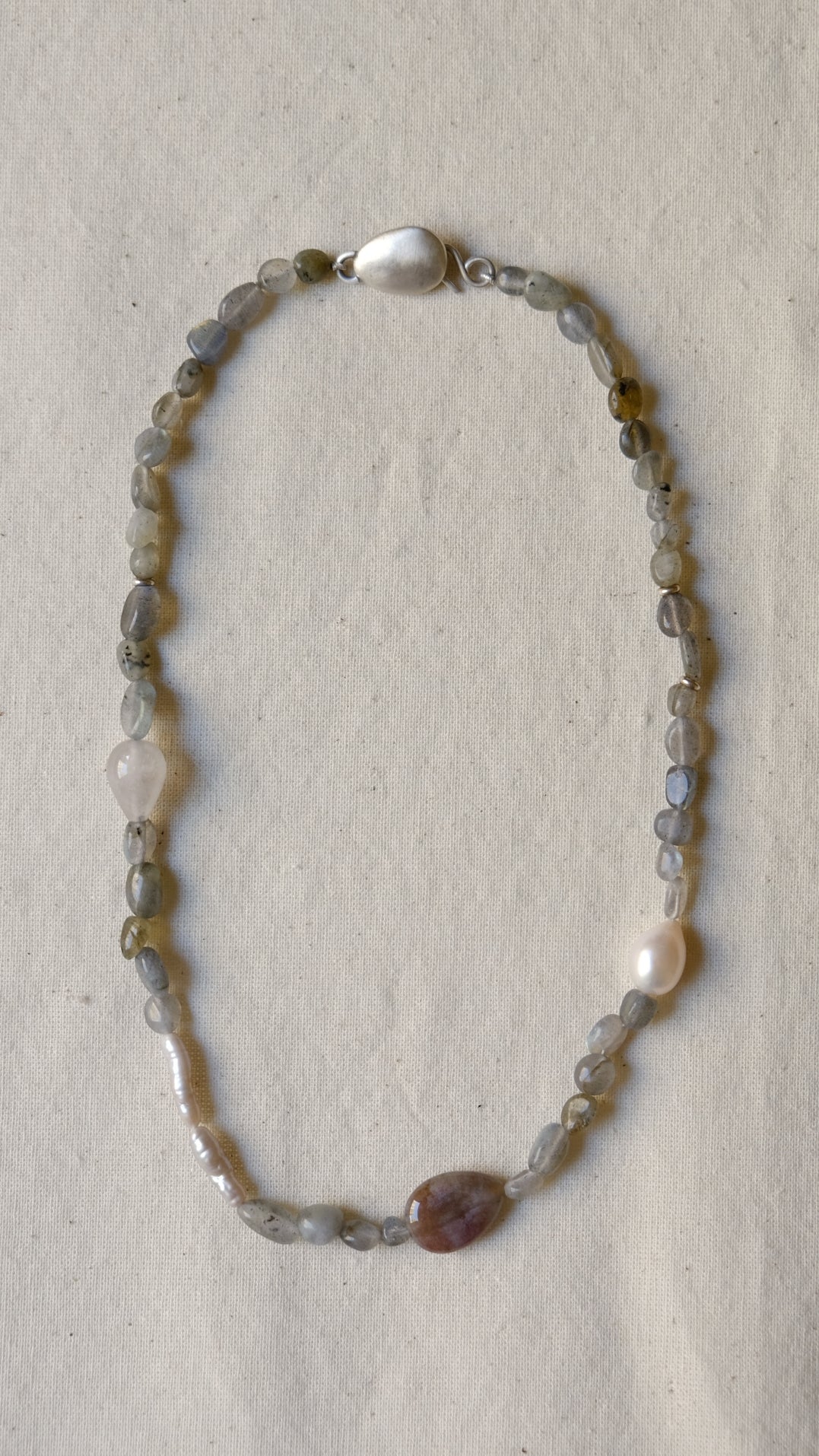 925 sterling silver, labradorite, quartz and baroque pearls.